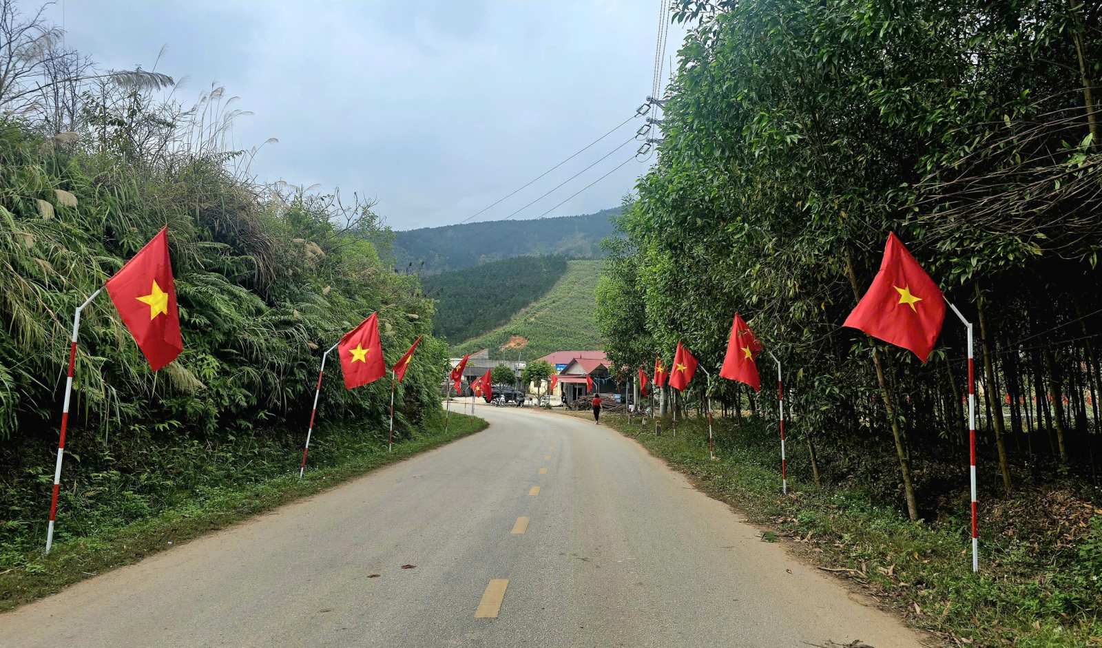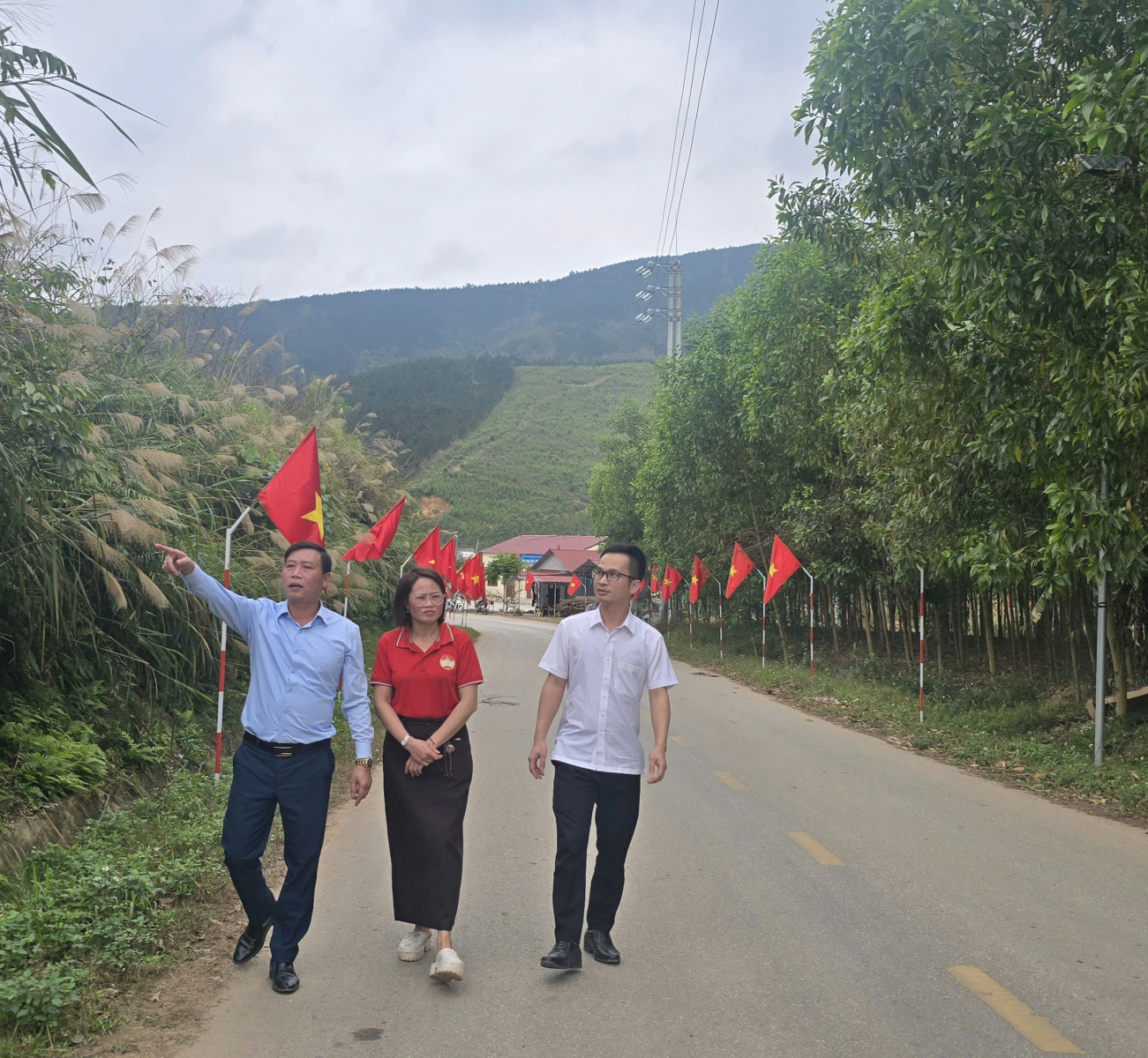 Đồng chí Phạm Văn Hoài thực hiện kiểm tra ác hoạt động trang trí, tuyên truyền tại thôn Pò Đồn