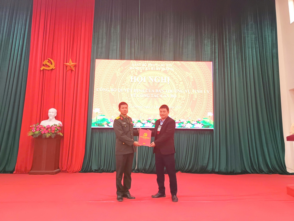 Đồng chí Vy Văn Bông, Bí thư Đảng uỷ, Chủ tịch HĐND xã trao Quyết định của Tỉnh uỷ cho đồng chí Nguyễn Xuân Hải