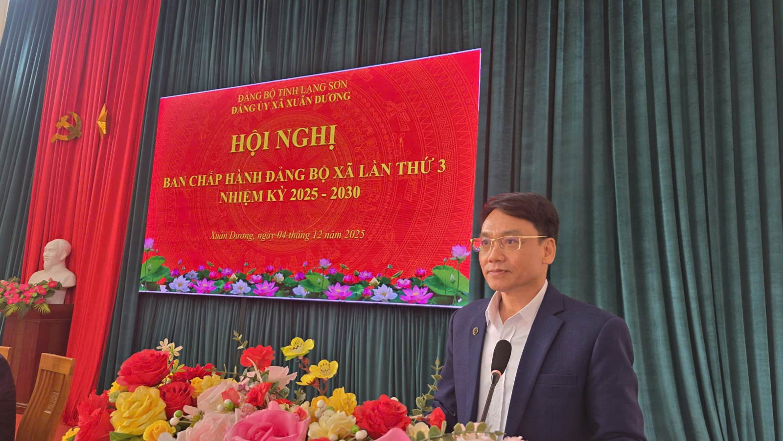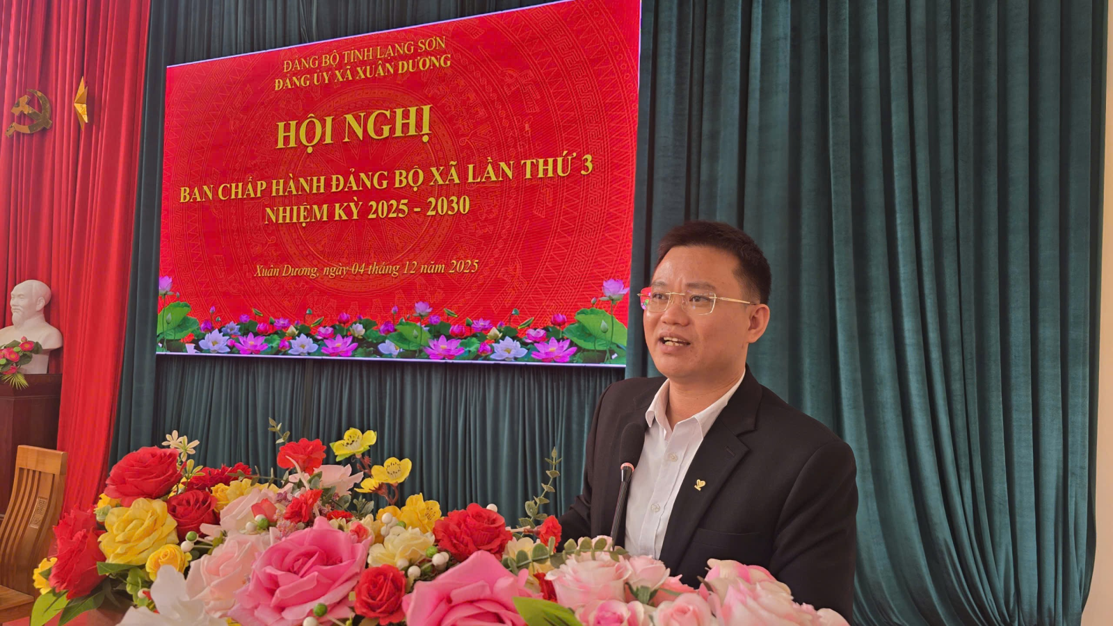 Ngày 04/12/2025, Đảng ủy xã Xuân Dương tổ chức Hội nghị Ban Chấp hành Đảng bộ xã lần thứ 3 nhiệm kỳ 2025-2030 (mở rộng) để đánh giá tình hình và kết quả công tác năm 2025, nhiệm vụ trọng tâm năm 2026. Dự hội nghị có đồng chí Nguyễn Đông Bắc, Tỉnh ủy viên, Giám đốc Báo và Phát thanh, Tuyền hình Lạng Sơn (phụ trách Đảng bộ xã Xuân Dương theo Quyết định số 58-QĐ/TU ngày 20/11/2025 của ban Thường vụ Tỉnh ủy phân công các đồng chí ủy viên Ban Thường vụ Tỉnh ủy, Ủy viên Ban Chấp hành Đảng bộ tỉnh; cán bộ lãnh đạo các sở, ban, ngành tỉnh phụ trách đảng bộ xã, phường). Đồng chí Đồng chí Vy Văn Bông, Bí thư Đảng uỷ, Chủ tịch HĐND xã và đồng chí Lành Kim Quang, Phó Bí thư Thường trực Đảng uỷ đồng chủ trì Hội nghị.