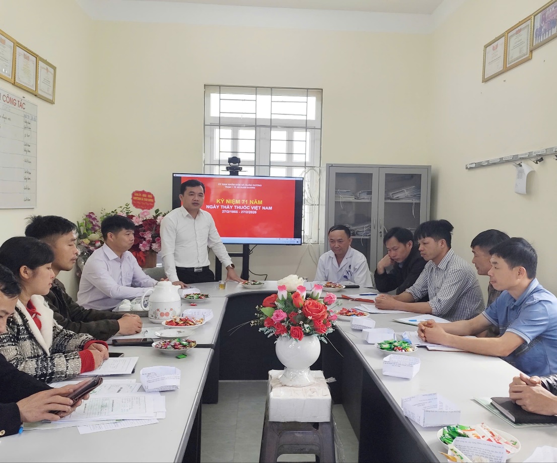 Nhân dịp kỷ niệm 71 năm Ngày Thầy thuốc Việt Nam (27/02/1955 – 27/02/2026), sáng ngày 27/02, đồng chí Hoàng Văn Đạt, Phó Chủ tịch UBND xã Xuân Dương thay mặt Đảng ủy, HĐND, UBND, Ủy ban MTTQ Việt Nam xã đến thăm, tặng hoa và chúc mừng tập thể cán bộ, y, bác sĩ Trạm Y tế xã Xuân Dương.