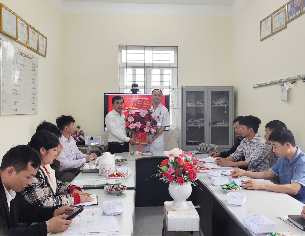 Tại buổi gặp mặt, thay mặt lãnh đạo Đảng ủy, HĐND, UBND, Ủy ban MTTQ Việt Nam xã, đồng chí Hoàng Văn Đạt đã gửi tới Trạm Y tế lẵng hoa tươi thắm, cùng những chúc mừng tốt đẹp nhất tới đội ngũ cán bộ, y, bác sĩ, nhân viên Trạm; đồng thời ghi nhận, biểu dương những nỗ lực, đóng góp quan trọng của đơn vị trong công tác chăm sóc, bảo vệ và nâng cao sức khỏe nhân dân trên địa bàn xã.