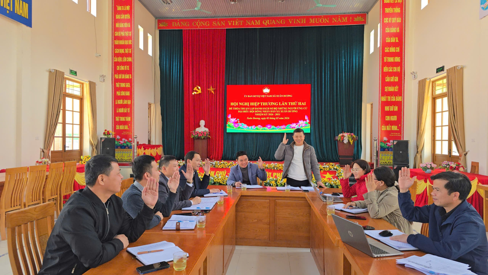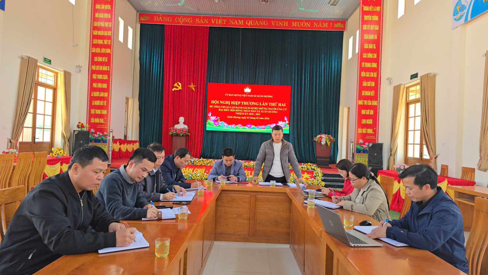 Chiều ngày 02/02/2026, Ủy ban MTTQ Việt Nam xã tổ chức Hội nghị Hiệp thương lần thứ hai để lập danh sách sơ bộ những người ứng cử đại biểu HĐND xã Xuân Dương nhiệm kỳ 2026-2031. Đồng chí Lý Văn Lý, Ủy viên Ban Thường vụ Đảng ủy, Chủ tịch Ủy ban Mặt trận Tổ quốc Việt Nam xã và đồng chí Đặng Văn Quý, Phó Chủ tịch Thường trực Ủy ban MTTQ Việt Nam xã kiêm Chủ tịch Hội Cựu Chiến binh xã đồng chủ trì Hội nghị. Dự có đồng chí Lành Kim Quang, Phó Bí thư Thường trực Đảng ủy; đồng chí Phạm Văn Hoài, Phó Bí thư Đảng ủy, Chủ tịch UBND xã, Chủ tịch Ủy ban bầu cử xã; đồng chí Hà Thanh Tuấn, Phó Chủ tịch HĐND xã; Thường trực HĐND xã, lãnh đạo Ủy ban Bầu cử xã; Ủy ban MTTQ và các đoàn thể thể xã; đại diện Phòng Văn hóa - Xã hội xã.