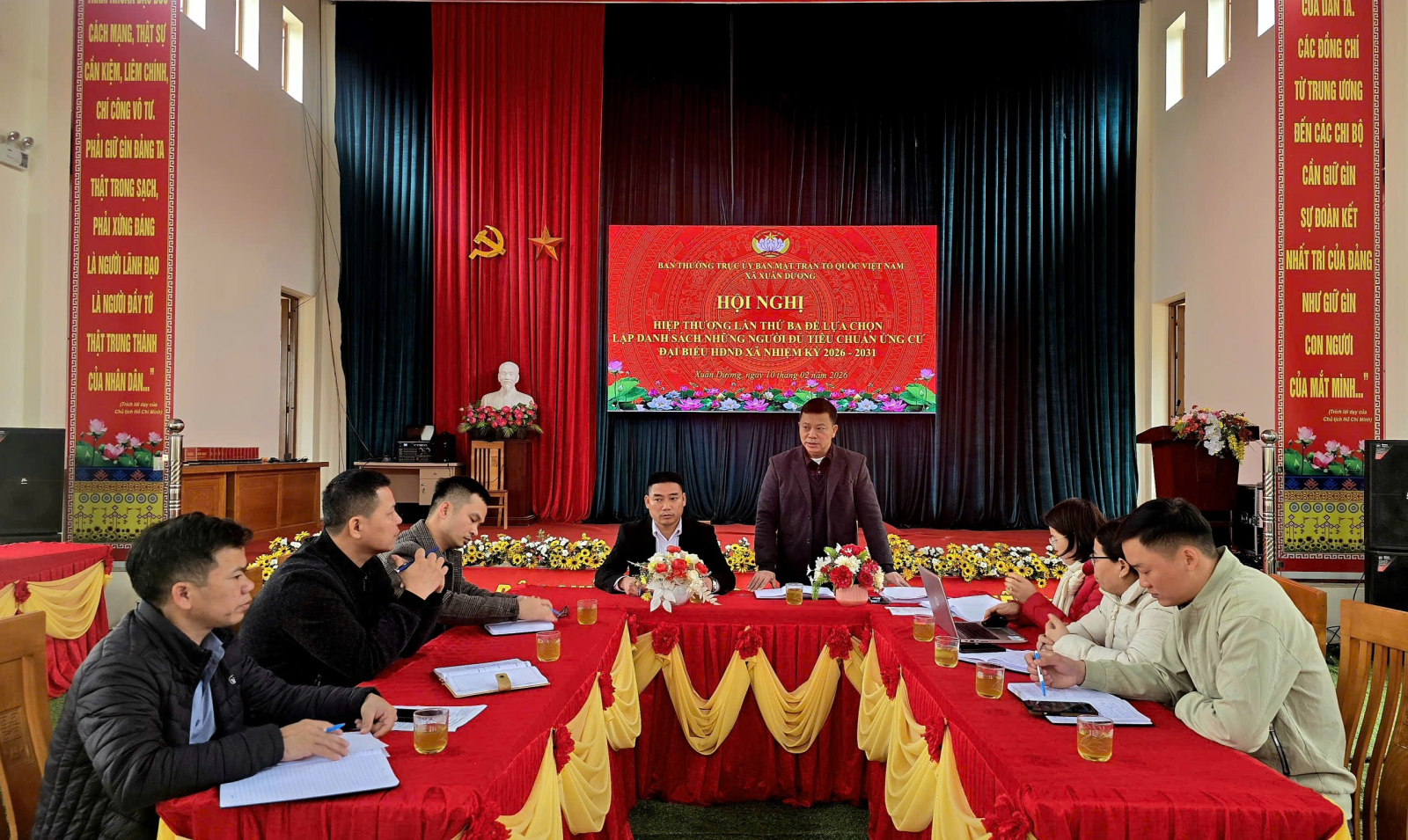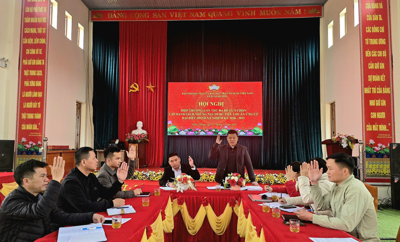Ngày 10/02/2026, Ủy ban Mặt trận Tổ quốc Việt Nam xã Xuân Dương tổ chức Hội nghị hiệp thương lần thứ ba để lựa trọn lập danh sách những người đủ tiêu chuẩn ứng cử đại biểu HĐND xã nhiệm kỳ 2026 - 2031. Đồng chí Lý Văn Lý, Ủy viên Ban Thường vụ Đảng ủy, Chủ tịch Ủy ban Mặt trận Tổ quốc Việt Nam xã và đồng chí Đặng Văn Quý, Phó Chủ tịch Thường trực Ủy ban MTTQ Việt Nam xã kiêm Chủ tịch Hội Cựu Chiến binh xã đồng chủ trì Hội nghị.