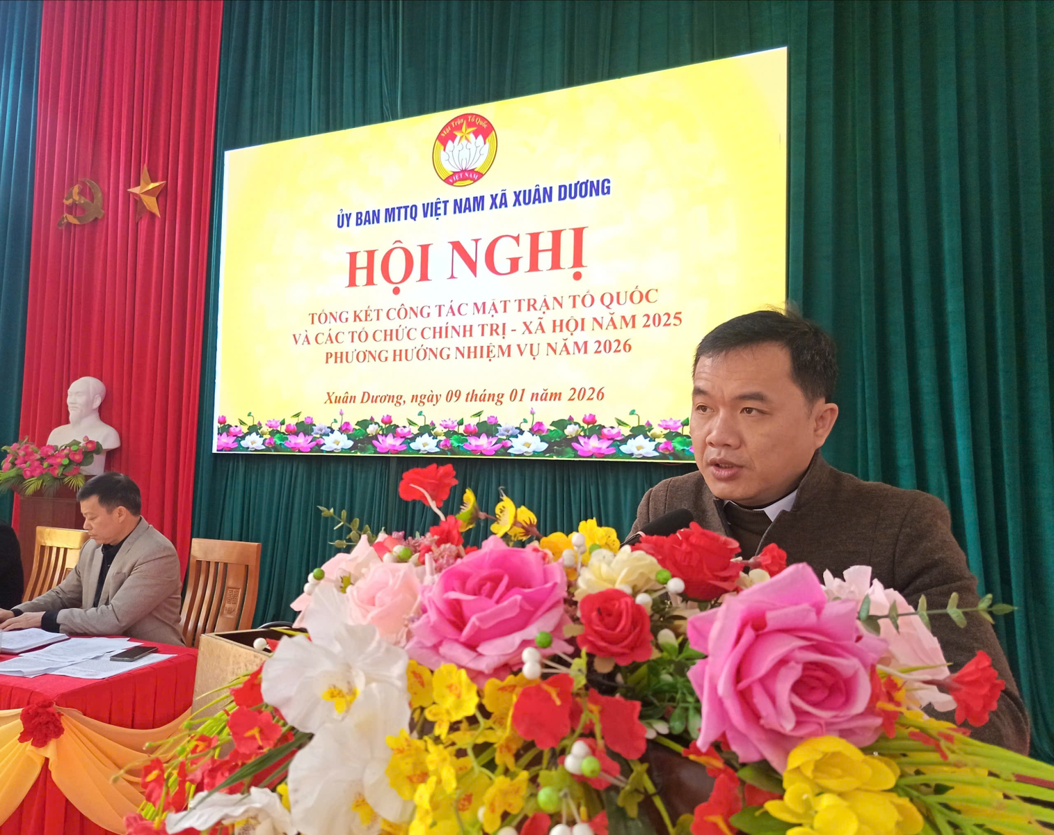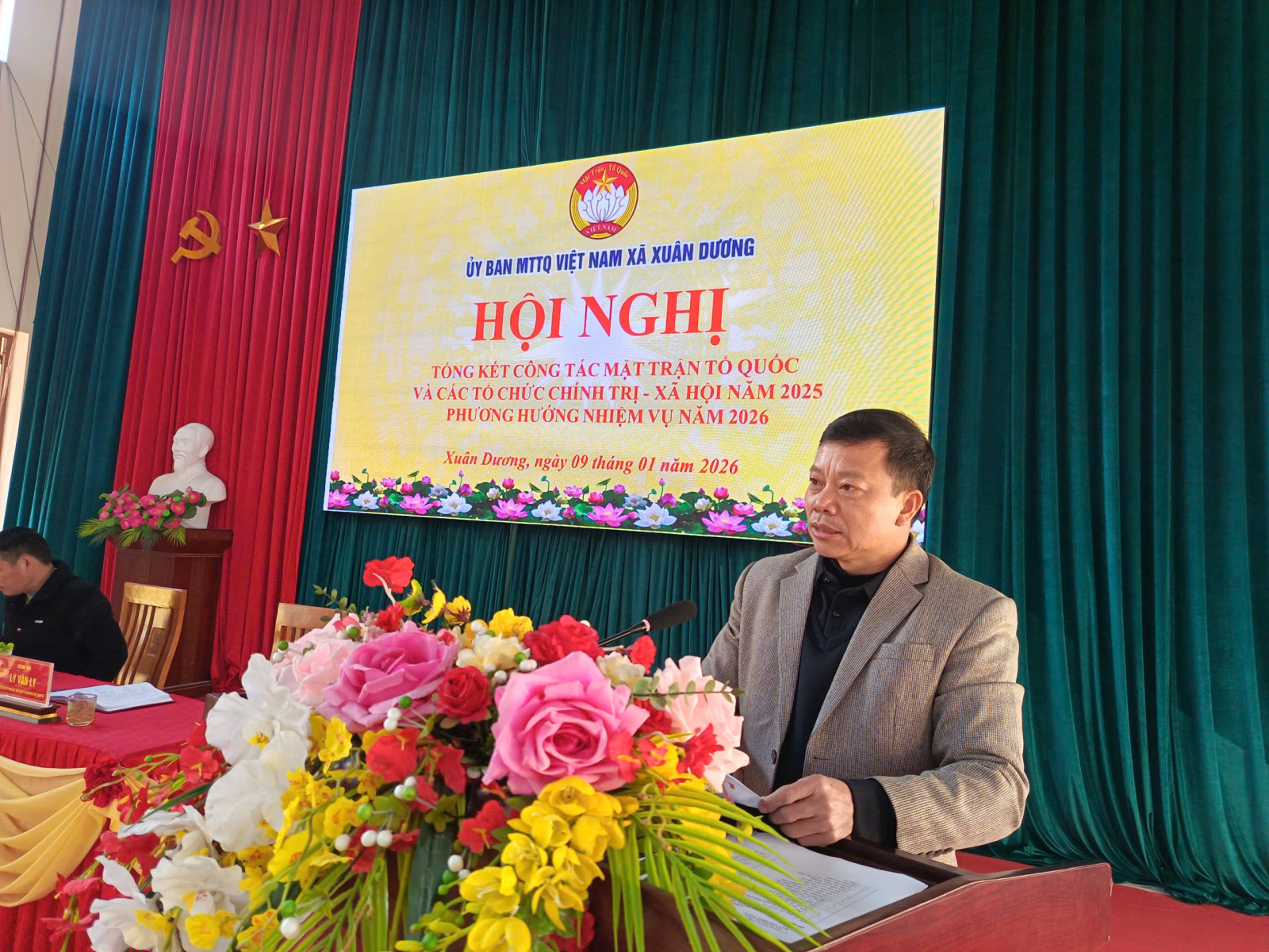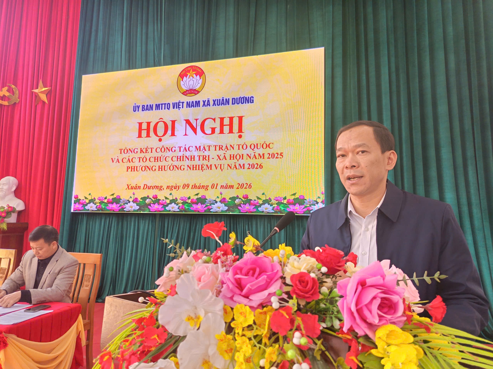 Ngày 09/01/2026, Ủy ban Mặt trận Tổ quốc Việt Nam xã Xuân Dương đã tổ chức Hội nghị lần thứ Hai Ủy ban MTTQ Việt Nam xã khóa I và tổng kết công tác Mặt trận và các tổ chức chính trị - xã hội năm 2025, triển khai phương hướng, nhiệm vụ năm 2026.