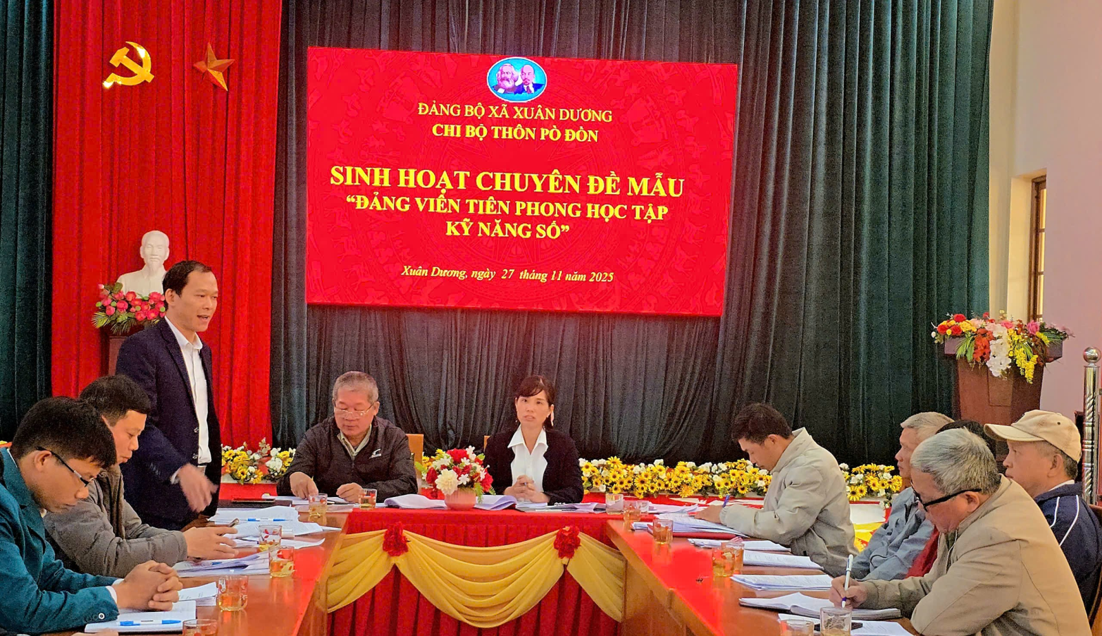 Thực hiện Kế hoạch số 29-KH/ĐU, ngày 24/10/2025 của Đảng ủy xã Xuân Dương về tổ chức sinh hoạt chuyên đề "Đảng viên tiên phong trong học tập kỹ năng số" trên địa bàn xã Xuân Dương. Chiều ngày 27/11/2025, Chi bộ thôn Pò Đồn thuộc Đảng bộ Xuân Dương tổ chức chức sinh hoạt chuyên đề “Đảng viên tiên phong học tập kỹ năng số”. Dự có đồng chí Lành Kim Quang, Phó Bí thư Thường trực Đảng ủy; các đồng chí Uỷ viên Ban Thường vụ Đảng uỷ, Uỷ viên Ban Chấp hành Đảng bộ xã; Bí thư các chi bộ thôn thuộc Đảng bộ xã Xuân Dương; đảng viên chi bộ thôn Pò Đồn.