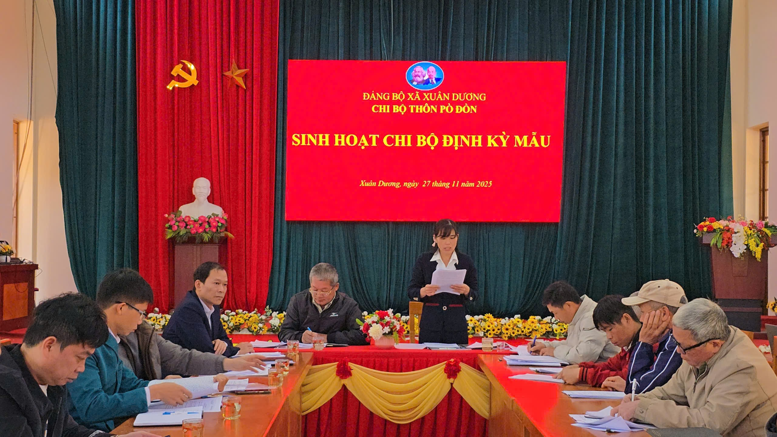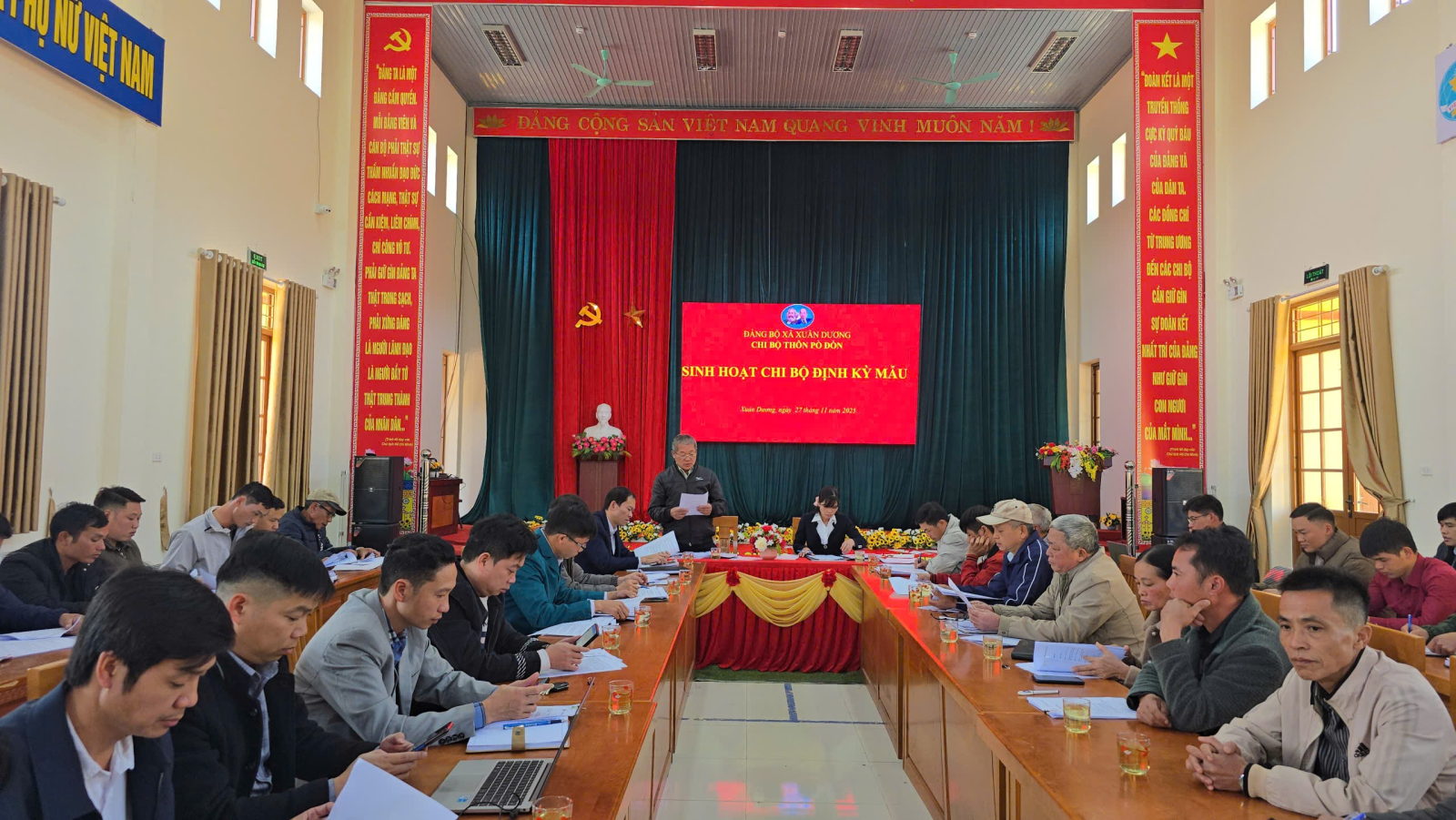 Thực hiện Kế hoạch số 15-KH/ĐU, ngày 28/8/2025 của Đảng uỷ xã Xuân Dương về thực hiện Chỉ thị số 50-CT/TW, ngày 23/7/2025 của Ban Bí thư về tiếp tục đổi mới và nâng cao chất lượng sinh hoạt chi bộ trong giai đoạn mới; Kế hoạch số 34-KH/ĐU, ngày 12/11/2025 của Đảng ủy xã về tổ chức sinh hoạt định kỳ và sinh hoạt chuyên đề mẫu. Chiều ngày 27/11/2025, Chi bộ thôn Pò Đồn thuộc Đảng bộ Xuân Dương tổ chức chức sinh hoạt định kỳ mẫu. Dự có đồng chí Lành Kim Quang, Phó Bí thư Thường trực Đảng ủy; các đồng chí Uỷ viên Ban Thường vụ Đảng uỷ, Uỷ viên Ban Chấp hành Đảng bộ xã; Bí thư các chi bộ thôn thuộc Đảng bộ xã Xuân Dương; đảng viên chi bộ thôn Pò Đồn.