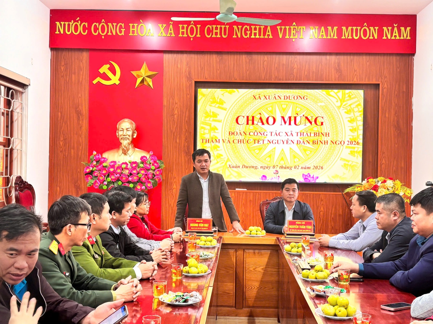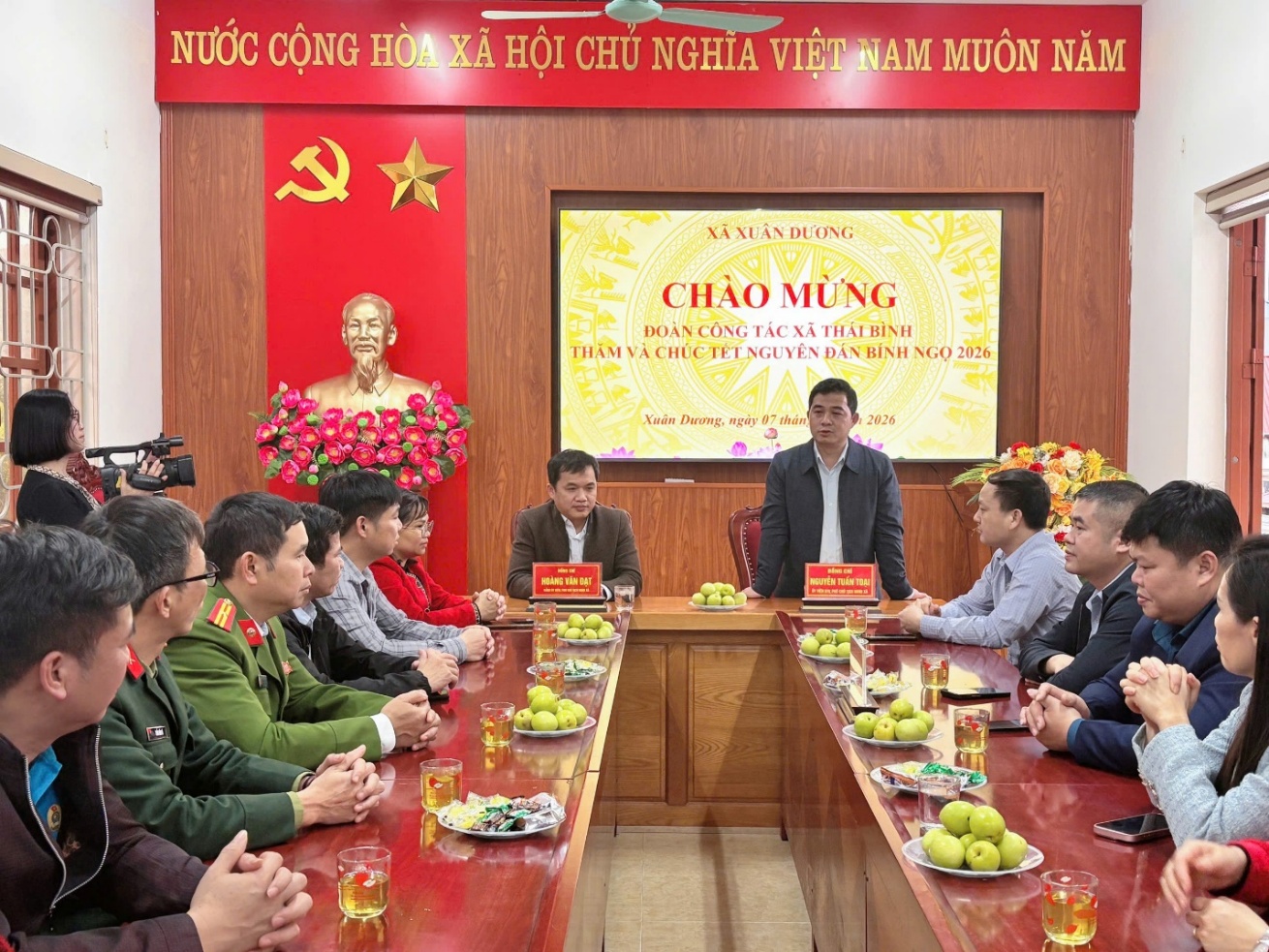 Ngày 07/2/2026, Đoàn công tác xã Thái Bình do đồng chí Nguyễn Tuấn Toại, Ủy viên Ban Thường vụ Đảng ủy, Phó Chủ tịch UBND xã Thái Bình làm Trưởng đoàn đã đến thăm và chúc Tết Đảng ủy, HĐND, UBND, Ủy ban MTTQ và Nhân dân xã Xuân Dương. Đón tiếp Đoàn công tác, có đồng chí Hoàng Văn Đạt, Phó Chủ tịch UBND xã; Lãnh đạo Ban xây dựng đảng, Ban Chỉ huy quân sự xã; thủ trưởng các cơ quan chuyên môn đơn vị thuộc UBND xã.